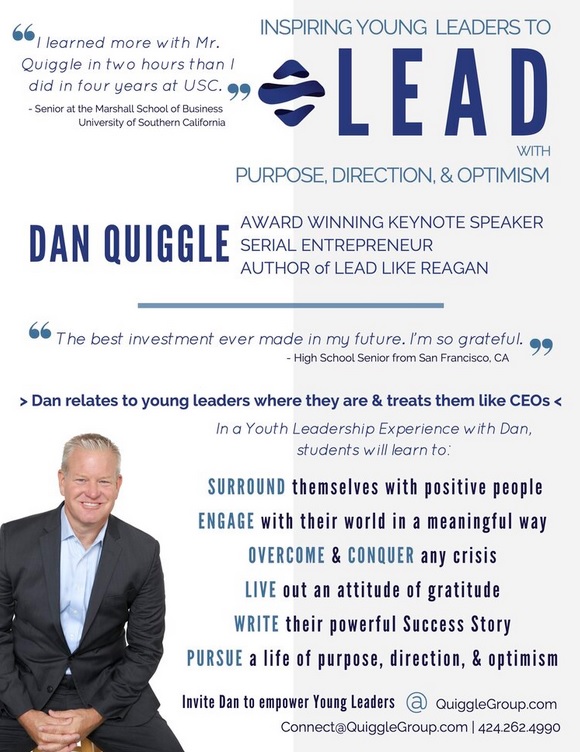Dan Quiggle is a dynamic, engaging, and energetic speaker delivering exhilarating stories and real-life applications to help guide, develop, and motivate youth. Dan connects with inspiring young leaders, helps them idenfity their Success Symbol using The Quiggle Assessment™, and teaches relevant values through an authentic message followed by a step-by-step approach to success.